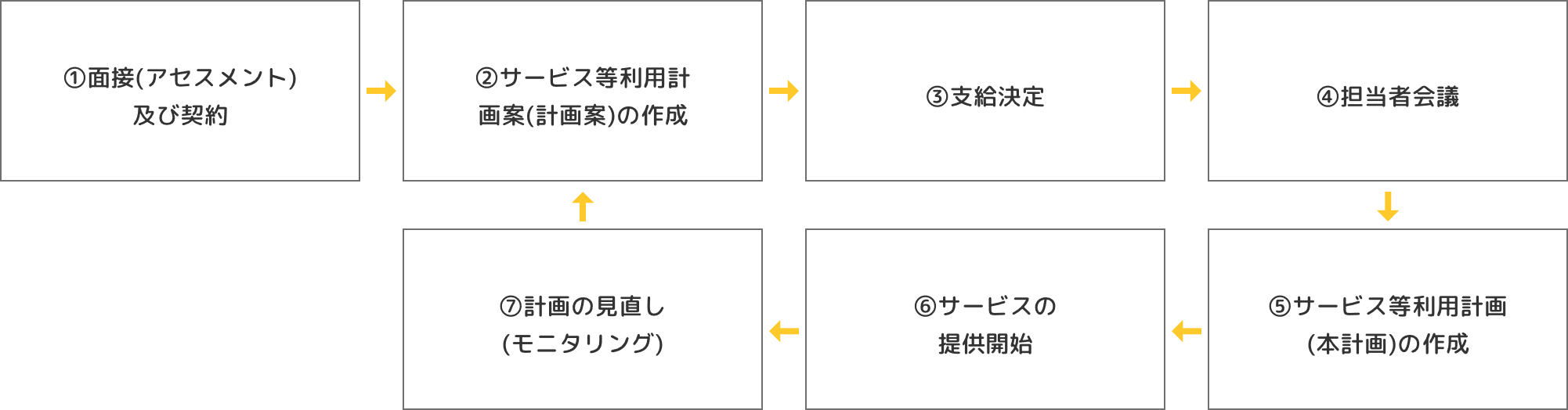 子どもさんが療育(児童発達支援、放課後等デイサービス)を利用される際に必要な児童支援利用計画を作成、18歳以上の方が就労支援などを利用される際に必要なサービス等利用計画を作成し、その後も継続的に本人の療育・就労利用についてモニタリング(利用者や家族の意向・ニーズに合っているか、目標が達成されているかを定期的に確認)を行います。
